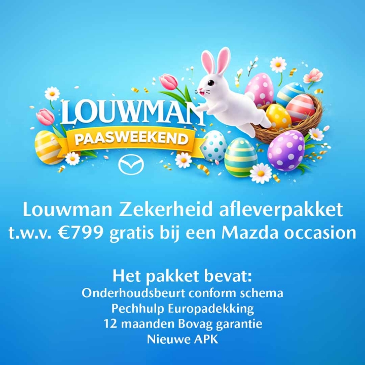 Tijdens het paasweekend, op 3, 4 en 6 april, profiteer je bij Louwman Mazda van een bijzonder voordeel. Schaf je in deze dagen een Mazda occasion aan, dan ontvang je van ons gratis het Louwman Zekerheidspakket ter waarde van €799,-.Een mooie extra, zodat je niet alleen in jouw nieuwe Mazda wegrijdt, maar ook met de zekerheid en het vertrouwen dat je van ons mag verwachten.
